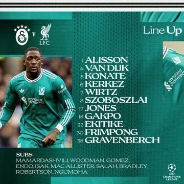 利物浦首发:1-阿利松、4-范戴克、5-科纳特、6-科尔克兹、7-维尔茨、8-索博斯洛伊、17-柯蒂斯-琼斯、18-加克波、22-埃基蒂克、30-弗林蓬、38-赫拉芬贝赫